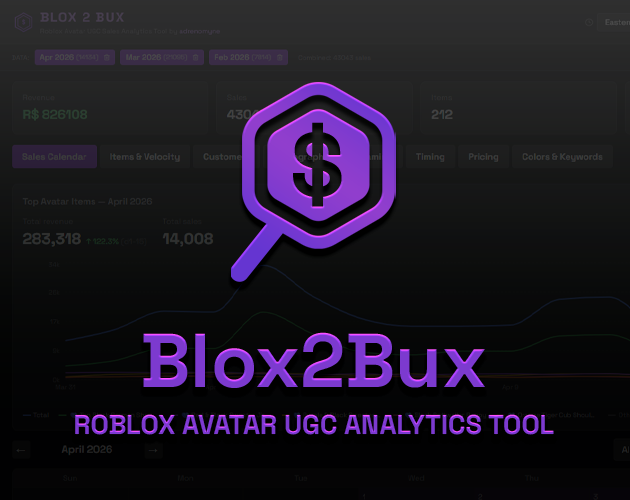 Blox2Bux is a free stand-alone app for Windows PC that allows Roblox UGC creators to dig into their analytics with a more visual and instant method, entirely confidentially. At no time does your data ever leave your machine, get uploaded anywhere on the internet, nada.